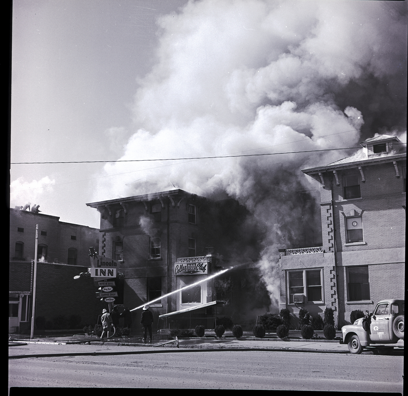 Tongues of flame lick through windows and smoke billows up from the Lincoln Inn in Gooding as fire fighters pour streams of water onto the building, to keep the fire from spreading. The Cellar Bar Club and Gooding County Court House offices in the building were also destroyed in the fire. A truck is parked on the side of the street outside the building, and long hoses trail over the street.