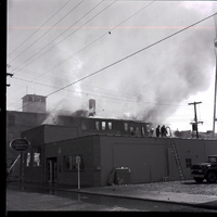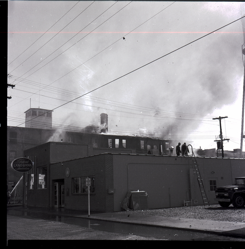 Tongues of flame lick through windows and smoke billows up from the Lincoln Inn in Gooding as fire fighters pour streams of water onto the building, to keep the fire from spreading. The Cellar Bar Club and Gooding County Court House offices in the building were also destroyed in the fire. Sitting on the block behind the Lincoln Inn is the Federal Land Bank Association building, which was unaffected by the fire.