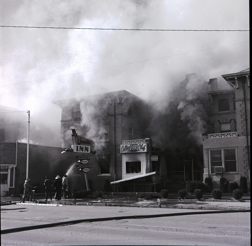 Tongues of flame lick through windows and smoke billows up from the Lincoln Inn in Gooding as fire fighters pour streams of water onto the building, to keep the fire from spreading. The Cellar Bar Club and Gooding County Court House offices in the building were also destroyed in the fire. Long hoses trail along the street.