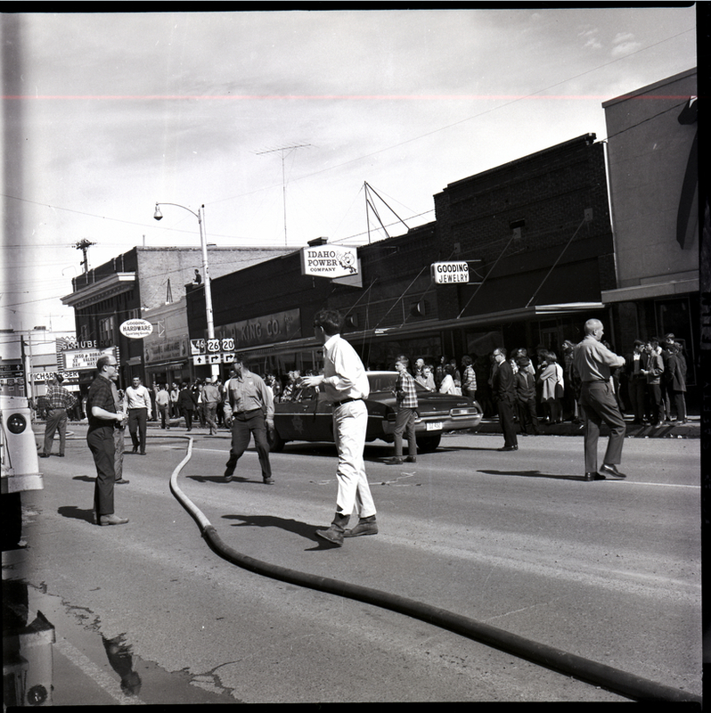 A group of people gather on the street in downtown Gooding to watch the fire from the Lincoln Inn, which also destroyed the Cellar Bar Club and Gooding County Court House offices in the same building. A long hose trails down the street, and a police car is parked in the center of the street. The Schubert Theater, Gooding Hardware Sporting Goods, H. H. King Co., Idaho Power Company, and Gooding Jewelry buildings are seen along the street.