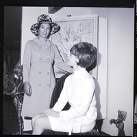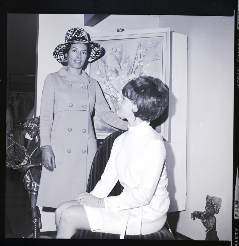 From left to right, Mrs. Robert Brailsford and Mrs. Bill Babcock prepare for the St. Edward's Parents Club annual fashion show. Fashions are provided by The Paris, Paris Jr., and Van's Department Store. Mrs. Brailsford is wearing a dress, gloves, and wide-brimmed hat, and Mrs. Babcock is wearing a turtleneck top and skirt. Behind them hangs a still-life painting of flowers by Mrs. Brailsford. A statue of a boy holding a lyre stands in the entryway to a large closet.