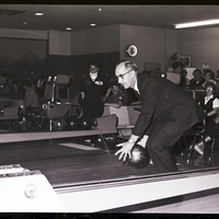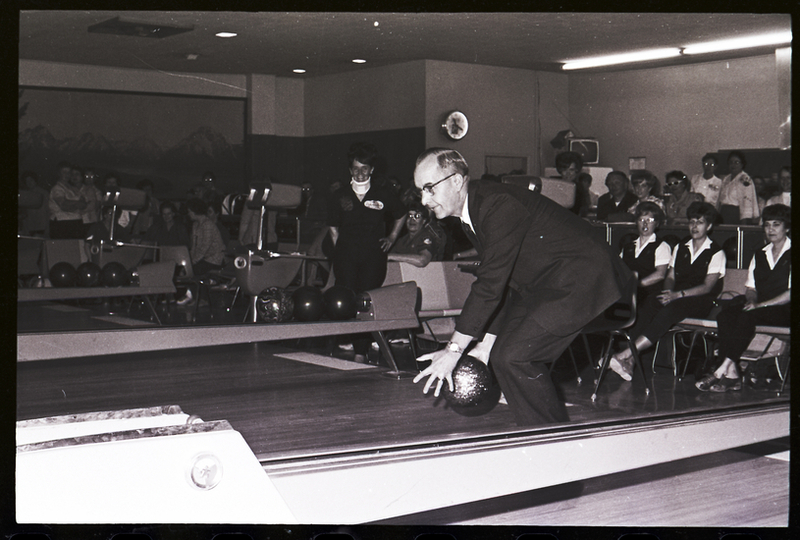Twin Falls mayor Egon Kroll throws the first bowling ball down a lane at the Magic Bowl, officially starting the Idaho State Woman's Bowling Association's 25th tournament. Several bowling balls are sitting on the ball return. A group of people sit in the seating area behind the lane, watching.