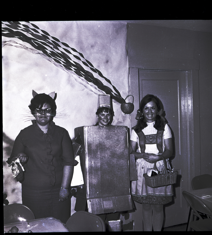 Three members of Nu Phi Nu chapter of Beta Sigma Phi are dressed as characters from "The Wizard of Oz" for their rush party, held at the home of Mrs. Loree Dobbs. From left to right are Katie Sherri, Mendy Abrams, and Mary Larsen. The girls are dressed as the Cowardly Lion, the Tin Man, and Dorothy. Behind them is a decorated background of a pot of gold with a rainbow of streamers arching from it.