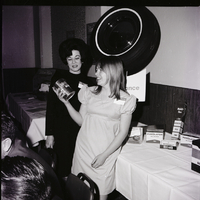 From left to right, Donna Ott and Judy Carver look over a display of car supplies given away as special prizes to guests at a party held for Magic Valley engaged girls at the Rogerson Hotel. The prizes were courtesy of the Twin Fails Bank and Trust Co., the Blue Lakes North Mobil Service and the Welcome Wagon hostesses. Miss Carver holds a can of oil. On the display table behind the women are boxes of oil filters and radiator hoses. A tire hangs on the wall behind them.