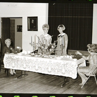 Two women sit at the ends of a table, helping themselves to punch at a Panhellenic Tea for high school seniors, hosted by nine sororities from the University of Idaho at the Bishop Rhea Auditorium. The table is covered in a lace tablecloth, and on it are cups, plates, bowls of punch, platters of cookies, a bouquet of flowers, and a candle holder. Two girls stand behind the table, and another stands to the side. Behind the table is a stage, and hanging on the back wall is a photograph of a man.
