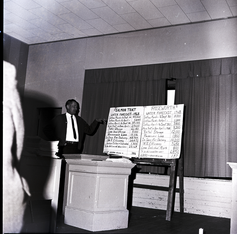 John Pastoor, chairman of the Twin Falls Soil Conservation District's snow survey committee, stands on a stage and goes over some charts on the water forecast for the 1968 irrigation season on the Salmon and Roseworth Tracts during a water forecast meeting held in Hollister. One chart is titled "Salmon Tract Water Forecast - 1968" and the other chart is titled "Roseworth Water Forecast 1968."