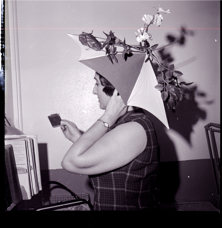 - Ola Cannon wears a hat shaped like an umbrella and decorated in plastic flowers. The hat was homemade for Easter and worn during the Ladies of the Elks hat parade.