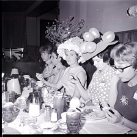 Attendees sit at a dining table enjoying lunch at the Welcome Wagon Newcomers Club hat luncheon held at Kay's Supper Club. Several of the woman are wearing unique hats. One woman is wearing a hat made out of branches and feathers, Rita Bradley is wearing a hat of white ruffles and flowers, and another woman is wearing a hat decorated with balloons. The table is covered in plates of food, cups, bowls, napkins, and silverware.