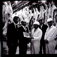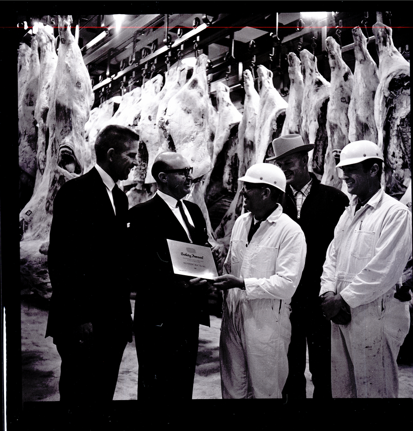 From left to right, Don Elliot and Dan Obenchain, dressed in suits and ties, present workers at the Independent Meat Company with the Industrial Indemnity Company Safety Award certificate for no lost time injuries on the job during 1967. Harry Whitmore, plant supervisor, holds the award certificate. Beside him are Otto Florence Jr., second from right, general manager of Independent Meat, and Jack Holloway, right, assistant foreman of the shipping department at Independent Meat. Mr. Whitmore and Mr. Holloway are dressed in hard hats and coveralls, and Mr. Whitmore is dressed in a cowboy hat and jacket. Behind them, several dead cows hang on meat wracks.
