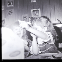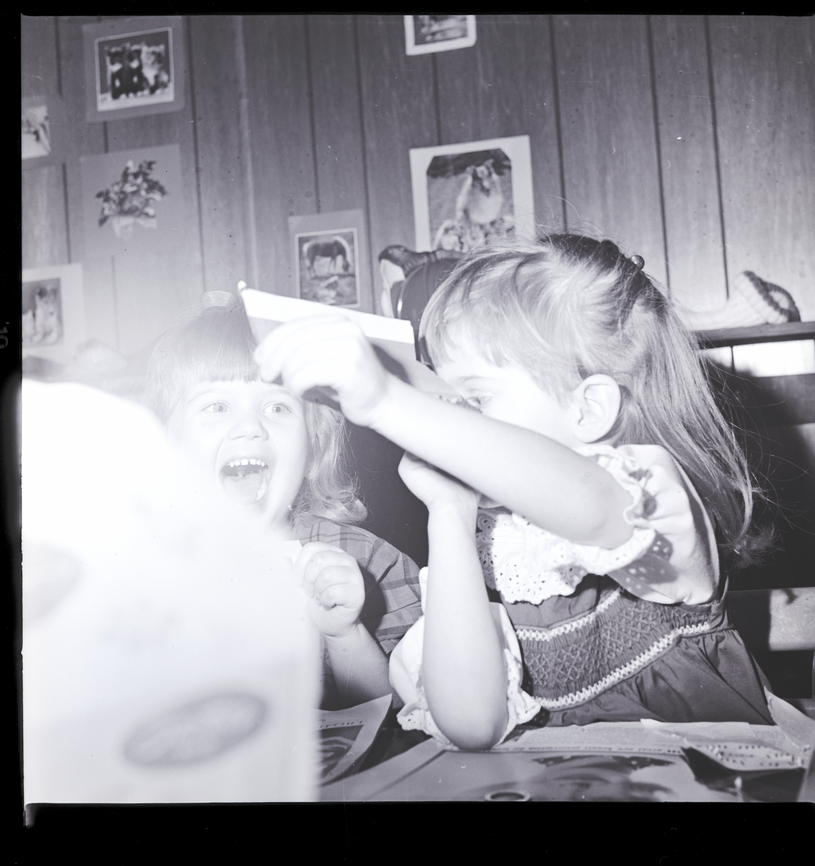 A little girl holds up a piece of paper while the girl beside her watches enthusiastically during class at Children's Village, a Montessorian method pre-school in Twin Falls run by Mrs. Charles Hopkins. On the desk in front of them are some opened magazines. Some pictures of animals are on the back wall.