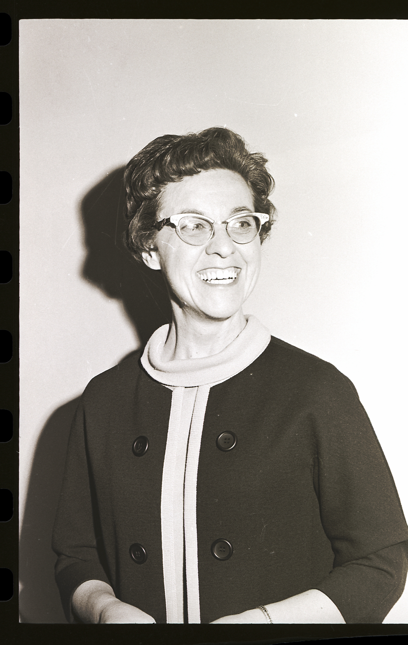 Dr. Adele Thompson, the Dean of Women at the College of Southern Idaho, stands beside a wall smiling. She is dressed in a jacket and a turtle neck.