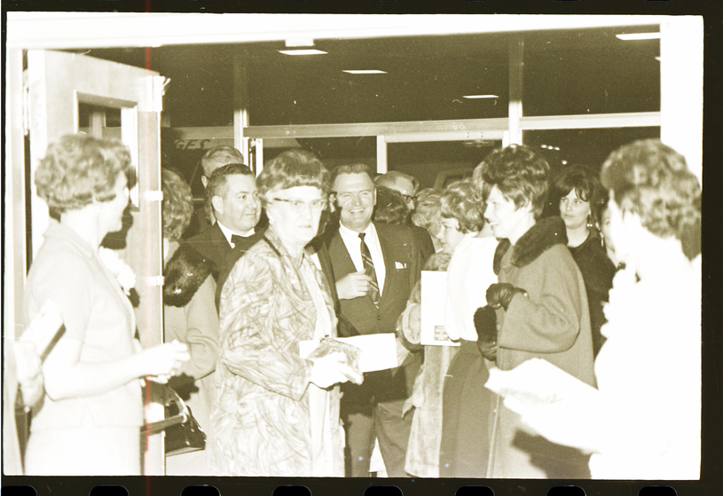 A group of people stand in a foyer of the Filer High School auditorium to see the opening performance of the Dilettante's production of "The Sound of Music." Several attendees are holding programs in their hands. Henry Wills is in the center of the group, dressed in a suit and tie.