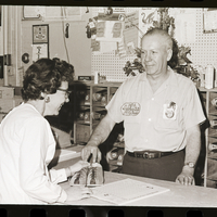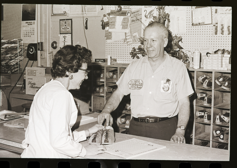 Earl Peterson, manager of the Magic Bowl in Twin Falls, hands a pair of bowling shoes over a counter to one of the women tournament bowlers for the 25th Idaho State Woman's Bowling Association Tournament. He is wearing a shirt with an embroidered patch on it that reads "1968-69 Idaho State Party Pooper." In his front shirt pocket is a pocket protector with pens and a comb in it. On the shelves behind him are several bowling shoes for rental, and on top of the shelves is a vase of flowers. Several calendars hang on the back wall.