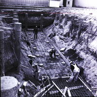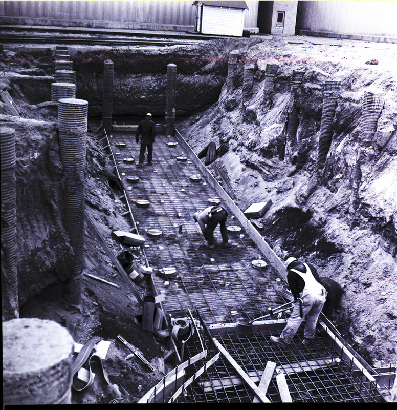 Several men in hard hats work on the the construction of the pit area of a 465,000 bag capacity dry bulk silo at the Mini-Cassia Amalgamated Sugar Co. plant near Paul, Idaho. Several round support beams are already in place, averaging 80 feet in depth as a foundation for the huge tank. Above the pit, the main factory and a small shack are visible.