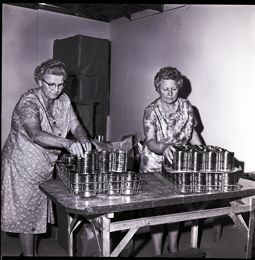 From left to right, Mrs. J. H. Sharp and Mrs. Don Hine, both directors of the Twin Falls Canning Kitchen, count cans for the next season. The cans are held in wire trays and sitting on top of a table in front of the women. Some boxes are stacked up in the corner behind them.