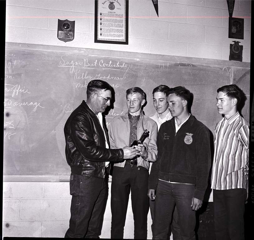 The Murtaugh FFA chapter is awarded with a trophy for winning the East Magic Valley FFA soils and land judging contest. Farnam Warr, supervisor of the West Cassia Soil Conservation District, presents the first place trophy to Mike Howard, while two other members of the winning team, Charles Davis and Joe Jones, watch. In the classroom behind them is a blackboard, and hanging on the wall above it are a plaque and a framed copy of the Future Farmers of America Creed.