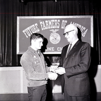 Russell Hall, district FFA advisor, hands an award pin to Clarence Tews, outgoing president of the Shoshone FFA chapter, during the FFA Parent-Son Banquet. Clarence Tews is wearing his FFA jacket, and several pins are on the front of it. He received the leadership award, livestock farming foundation award, and the chapter's star farmer award. Behind them is a stage and above it a large sign reads "Future Farmers of America Shoshone Chapter."