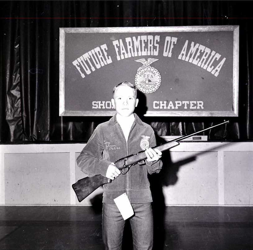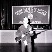 Larry Johnson holds up his award rifle at the Shoshone FFA chapter Parent-Son Banquet. He is wearing his embroidered FFA jacket. Behind him is a stage and above it a large sign reads "Future Farmers of America Shoshone Chapter."