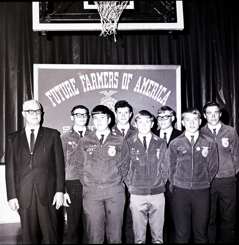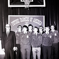 Shoshone FFA chapter officers gather at the Parent-Son Banquet. From left to right are Russell Hall, district FFA advisor; Stanley Kerner, secretary; Kevin Guthrie, president; Larry Kerner, vice president; John McGhee, treasurer; Carl Pendleton, program of work chairman; Layne Hadlock, reporter; and Bruce Helsley, sentinel. Behind them is a stage and above it a large sign reads "Future Farmers of America Shoshone Chapter." Above them is a basketball hoop.