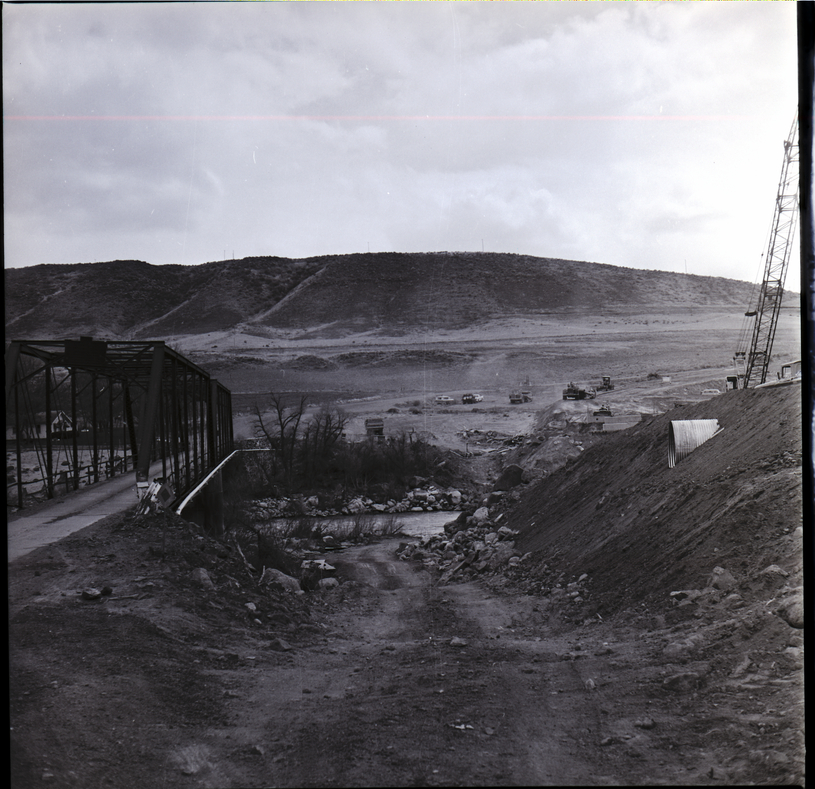 To the left, several trucks and cranes work on the construction of the Clear Lakes Bridge. To the right, the existing bridge is seen crossing over the Snake River. Small trees and rocks line the river bank. In the background is a house, and beyond it are hills covered in sagebrush.