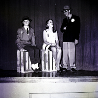 From left to right, Colleen Arrington, Janice Cook, and Mark Golay perform a skit during the Talent Show at O'Leary Junior High School. The girls sit on crates on the stage. Colleen is wearing striped pants, a jacket with a flower on the lapel, a tie, and a hat. Janice is wearing a dress. Mark is dressed in slacks, a jacket, a tie, and a hat. Behind them, the stage curtain is drawn across the stage.
