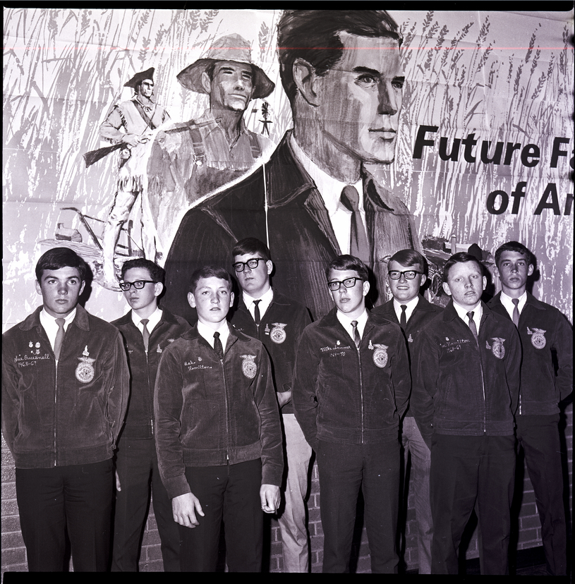 Twin Falls FFA chapter adviser and officers gather at the Parent-Son Banquet. In attendance are Archie Quesnell, Bob Hamilton, and Mike Sommer. A banner hangs on the wall behind them reading "Future Farmers of America" that has an illustrated of a mountain man, a farmer, and a businessman on it.