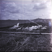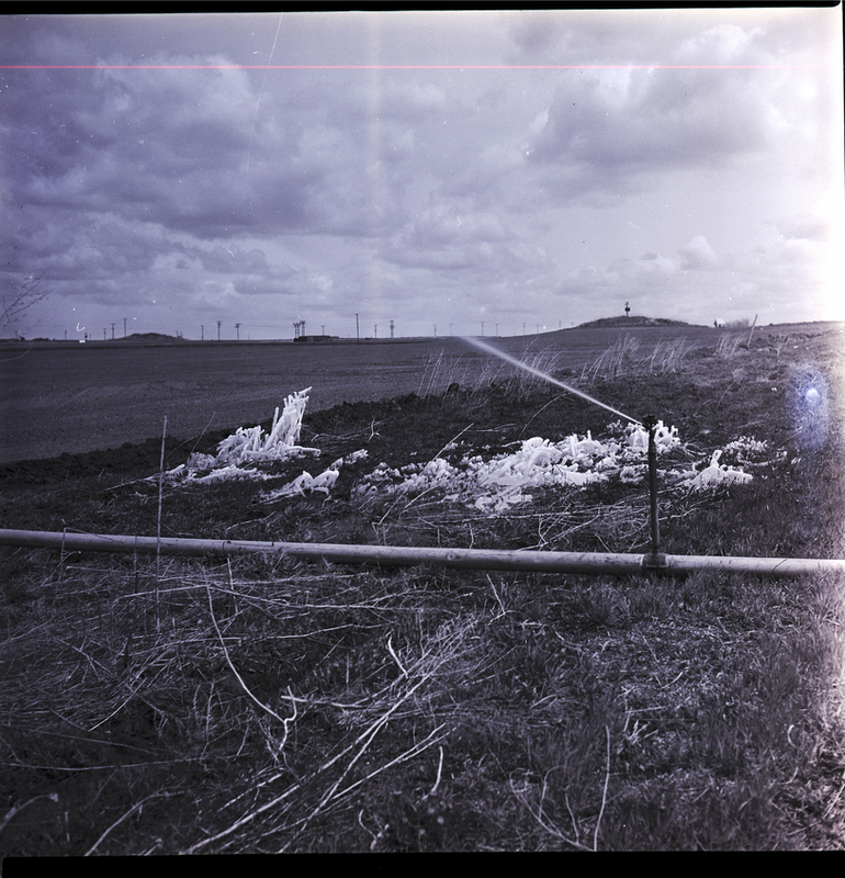 Ice formations are visible on a field in Jerome county from irrigation sprinklers being left on overnight. Fields and power lines stretch out into the distance.