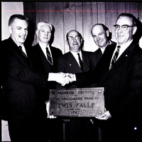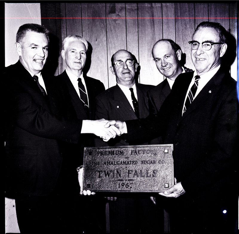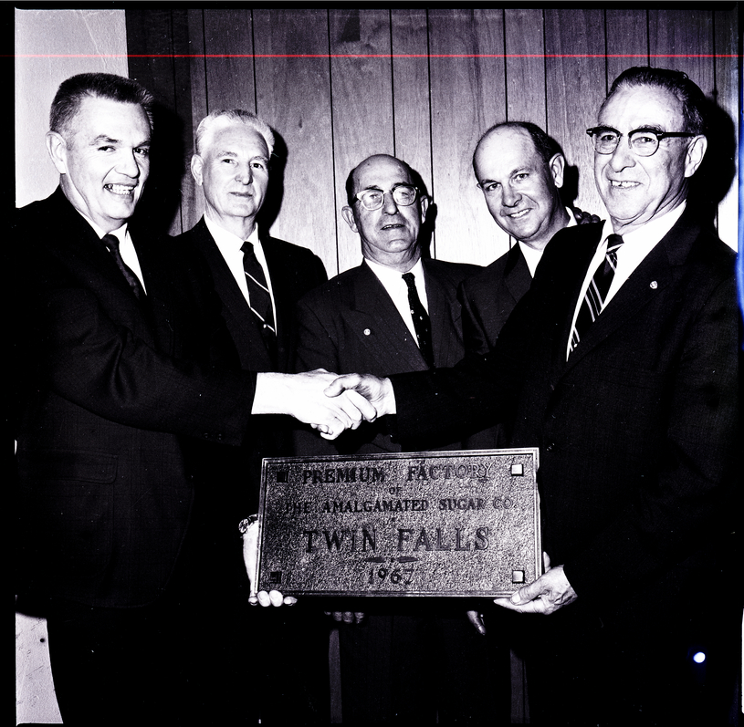 Part of the personnel at the Twin Falls Amalgamated Sugar Co. plant hold an award plaque that reads "Premium Factory of the Amalgamated Sugar Co. Twin Falls 1967" in a dining room at the Depot Grill. From left to right are S. M. Heiner, chief engineer; Melvin A. Fuller, assistant master mechanic; William F. Day, assistant master mechanic; A. Stanley Brown, assistant master mechanic, and Raymon B. Troxel, master mechanic. The men are dressed in suits and ties, and Mr. Heiner and Mr. Troxel are shaking hands.