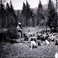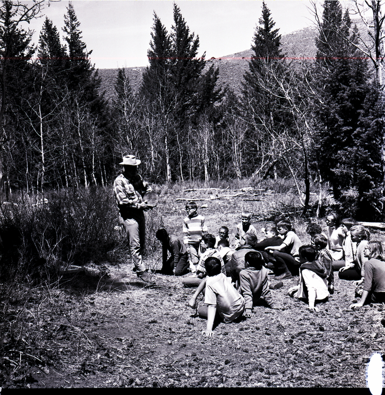 A man speaks to a group of Minidoka and Cassia County sixth graders about forestry on a conservation tour of Howell Canyon. The man holds up a cut tree log, showing the tree rings to the group of children sitting on the ground listening. Rocks, wild grass, and trees cover the area.