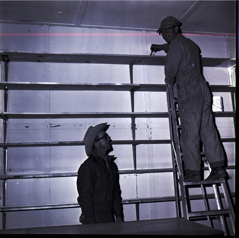 - Mr. Tom Shouse, general manager of the Twin Falls County Fairgrounds, watches Bud Penny paint in the Antiques building. Mr. Shouse is dressed in a jacket and a cowboy hat, and Mr. Penny is dressed in coveralls and a hat and stands on a ladder painting some shelving.
