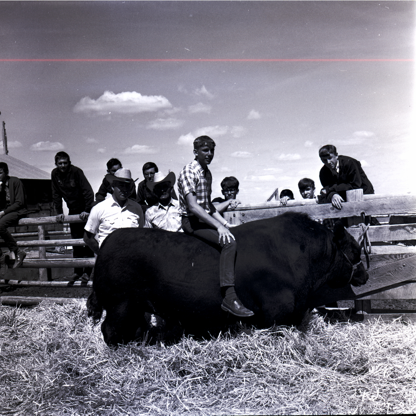 A boy sits on top of a bull at the East Magic Valley FFA District Livestock Contest held at the Jim Brooks Ranch in Hazelton. Two men dressed in cowboy hats stand beside him. Behind him is a fence, and several FFA members are propped up on the fence, looking at the bull. A barn is in the background.