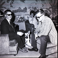 Jay Hill, left, sits on a recliner and Bob Caron, right, sits on a footrest at a party for students of the Idaho State Deaf and Blind School, held at the home of Mrs. E. W. McRoberts and hosted by the Twin Falls Delta Gamma Alumnae Association. Bob Caron is an instructor at the school. The two blind men are dressed in suits and ties and sunglasses. A German Shepherd lies on the ground beside them. A woman sits in a recliner at the back of the room. The back wall is decorated with a wallpaper covered in plants, trees, and mountains.