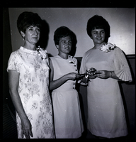 KEL 875 Smorgasbord dinner and installation ceremonies highlighted the recent meeting of the Twin Falls BPOE Ladies of Elks. Mrs. Roy Russell, left, was mistress of ceremonies for the event; Mrs. John Christofferson, center, is the incoming president, and Mrs. Michael Stover, right, is outgoing president. Mrs. Stover hands a gavel to Mrs. Christofferson. The three women are wearing dresses, and Mrs. Russell and Mrs. Stover are wearing corsages.