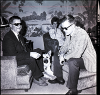 KEL 882 Jay Hill, left, sits on a recliner and Bob Caron, right, sits on a footrest at a party for students of the Idaho State Deaf and Blind School, held at the home of Mrs. E. W. McRoberts and hosted by the Twin Falls Delta Gamma Alumnae Association. Bob Caron is an instructor at the school. The two blind men are dressed in suits and ties and sunglasses. A German Shepherd lies on the ground beside them. A woman sits in a recliner at the back of the room. The back wall is decorated with a wallpaper covered in plants, trees, and mountains.