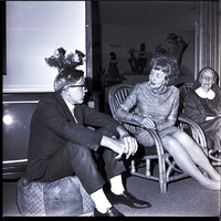 KEL 884 Gary McKinley visits with Dorothy Chapman, president of the Twin Falls Delta Gamma Alumnae Association, at a party for students of the Idaho State Deaf and Blind School held at the home of Mrs. E. W. McRoberts. A nun sits in a wicker chair to Mrs. Chapman's right. A television is pressed against the back wall behind the man.