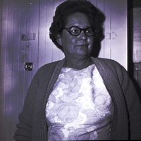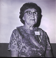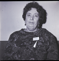 KEL 985 003 Mrs. Orville Sackett, superintendent of youth for the Twin Falls County Fair, stands beside a wall. She is wearing a floral-print blouse with a name tag pinned onto the front.