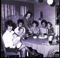 KEL 986 A get-acquainted tea in honor of Gloria Keppner, right, new physical education teacher at O'Leary Junior High School, was hosted recently by Mrs. Earl Lake and her daughter, Mrs. Dave Roberts at the Lake home. Mrs. Roberts, standing, is serving, from left to right, Mrs. Larry Watson and her daughter Shelley, Mrs. Michael Broadwater and her son Mike, and Mrs. Ron Watson. Mrs. Watson's