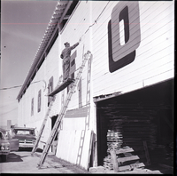KEL 984 A man stands on a ladder and paints the outside of the rodeo stands at the Twin Falls County Fairgrounds. The word "Rodeo" is painted in large letters along the side of the structure. Several planks of wood are piled in the entryway to the stands, and some trucks are parked to the left.