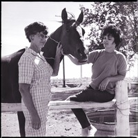 KEL 982 Two members of the Miss Rodeo Idaho Contest Committee, Mrs. Alma Vickers, left, and Mrs. Jeanette Peterson, right, pet a horse. The two women work many weeks to schedule events for the candidates at the Twin Falls County Fair. A wooden fence surrounds the corral, and a large metal tub of water in inside the corral. Beyond the fence are some trees.