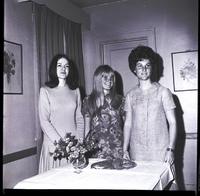 KEL 911 Three girls from Twin Falls were selected as alternates to attend Girls State at Northwest Nazarene College in Nampa by the Twin Falls High School faculty and the American Legion Auxiliary of Twin Falls. The girls stand beside a table. One the table is a vase of flowers and a platter of cookies. Two framed pictures of flowers in vases hang on the walls. A long curtain is drawn over a window in the corner.
