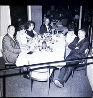 KEL 908 Members of the Welcome Wagon Newcomers Club enjoy drinks during a formal club dinner-dance held at the Blue Lakes Country Club. From left to right are Frank Overand, Mrs. Frank Overand, Mrs. Jim Curtright, Jim Curtright, and Mrs. Max Euteneier. The table is covered in a white tablecloth, and several cups, some candle holders, and a centerpiece of flowers is on the table. Some other diners are seen in the background.