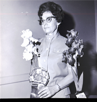 KEL 904 Mrs. Carl Crooks holds up a glass Coca-Cola bottle of irises titled "Tall Chief" at an iris show sponsored by the Magic Valley Iris Society and held at the Twin Falls YMYWCA. On the bottle is an award ribbon that reads "First Place American Iris Society."