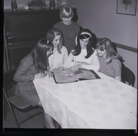 KEL 913 Attending Girls State at Northwest Nazarene College in Nampa, from Twin Falls, are seated from left to right, Susan Billington, Barbara Barker, Cynthia Ronk, Paula Hawks, and Kathy Lincoln. Standing behind them are three alternate attendees. The girls were selected by the Twin Falls High School faculty and the American Legion Auxiliary of Twin Falls. The group of girls sit around a table looking at a scrapbook. The table is covered in a white tablecloth. Against the back wall is a piano. On top of the piano is a small clock, a centerpiece of a basket of silk flowers, and some lamps. Beside the piano is an end table, a folding chair, and a pair of crutches propped up against the wall. A picture of a bouquet of flowers hangs on the side wall.